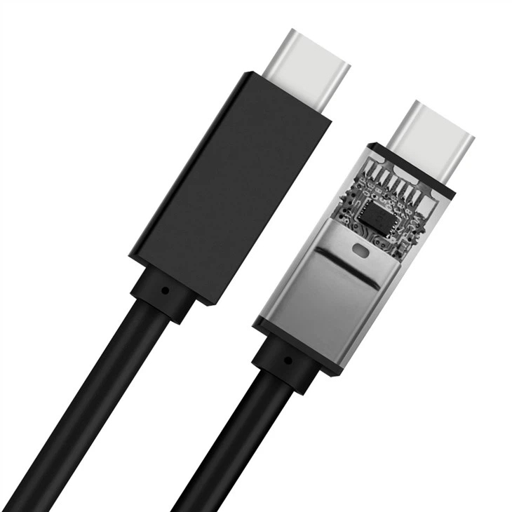 Advanced active Thunderbolt 3 cable with transceivers and electronics regulates the data transfer through the cable for reliable connection and performance